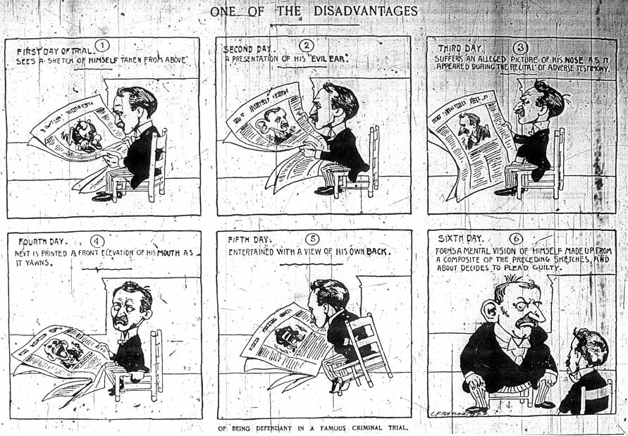 A cartoon on the dangers of being drawn by courtroom sketch artists. Chicago Daily News, Sept. 1, 1897.